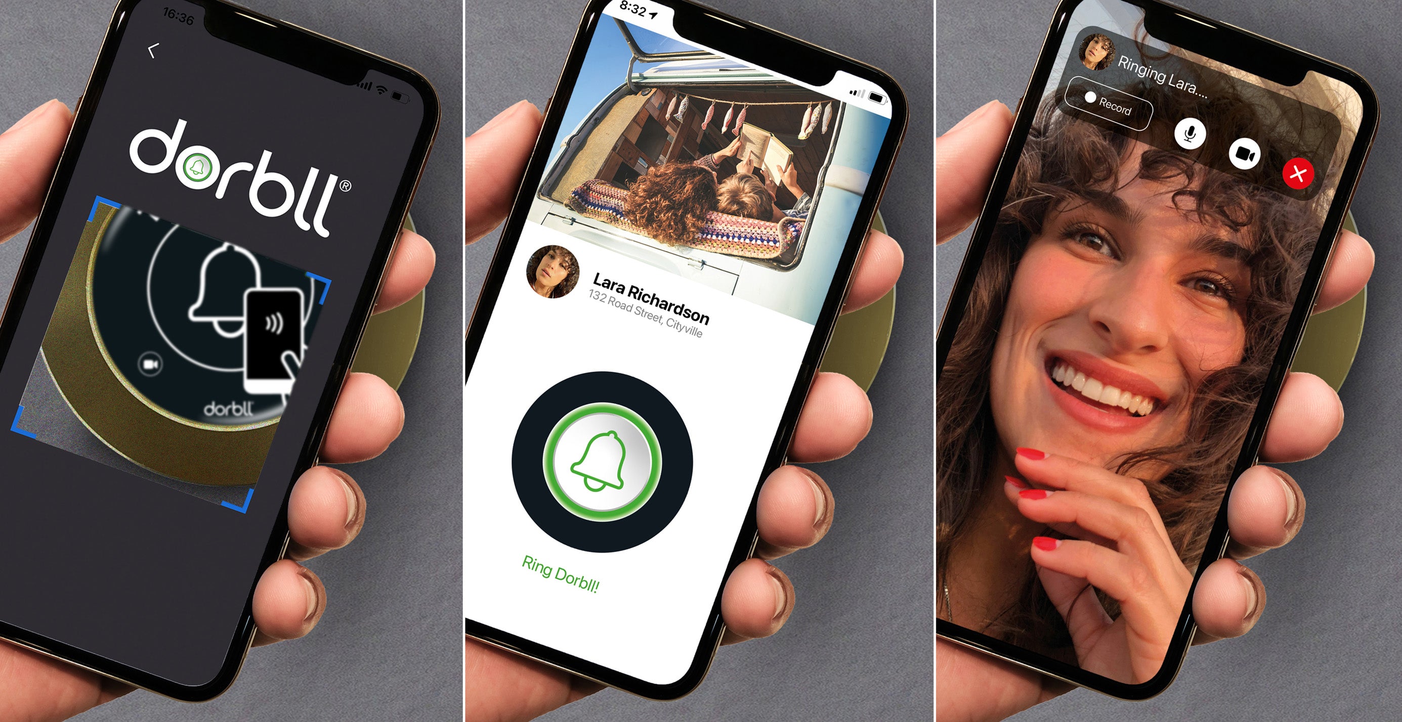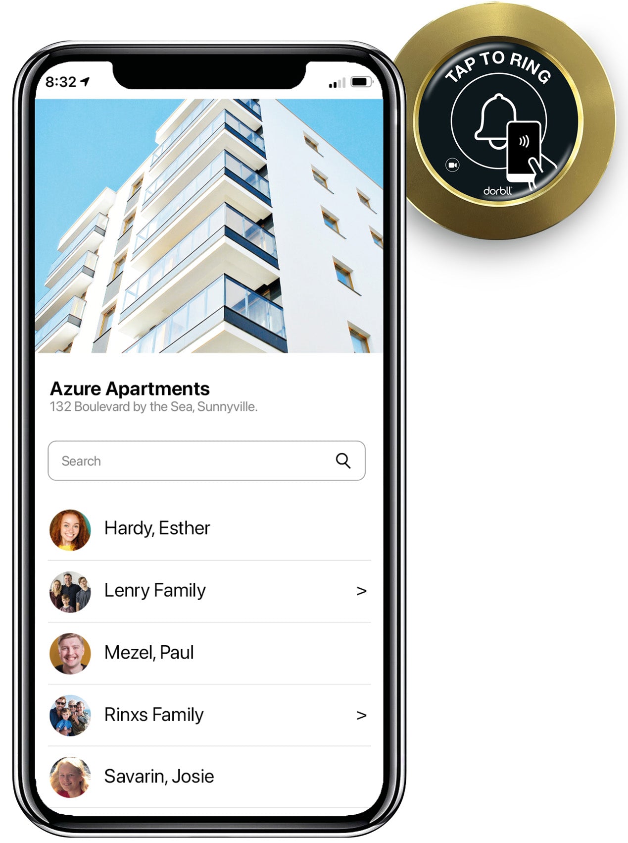 When visitors arrive, they tap Dorbll® Bell on the building – no app required. A directory instantly appears on their smartphone. They select a name, tap to call, and start a video conversation through the intuitive Dorbll® app.